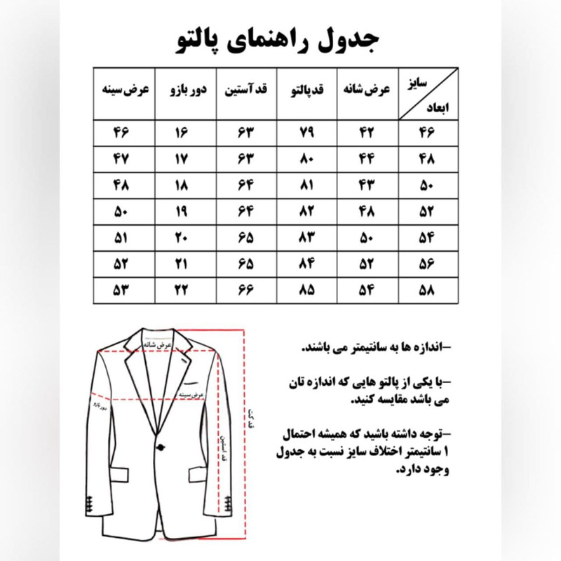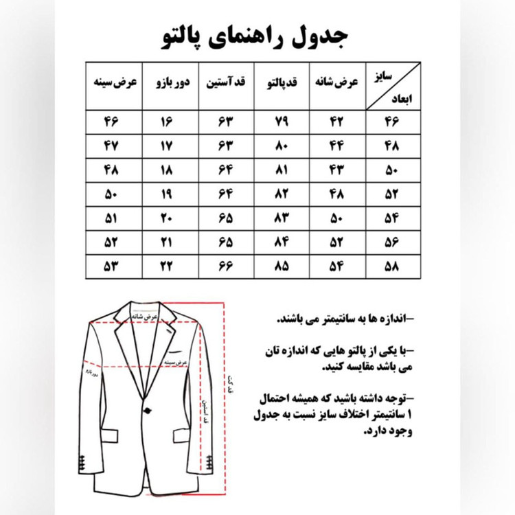 - ابعاد لباس برای سایز 50 برابر : قد پالتو برابر با 86 سانتیمتر عرض سینه برابر با 54 سانتیمتر قد آستین برابر با 64 سانتیمتر اندازه یقه تا سرشانه برابر با 19 سانتیمتر