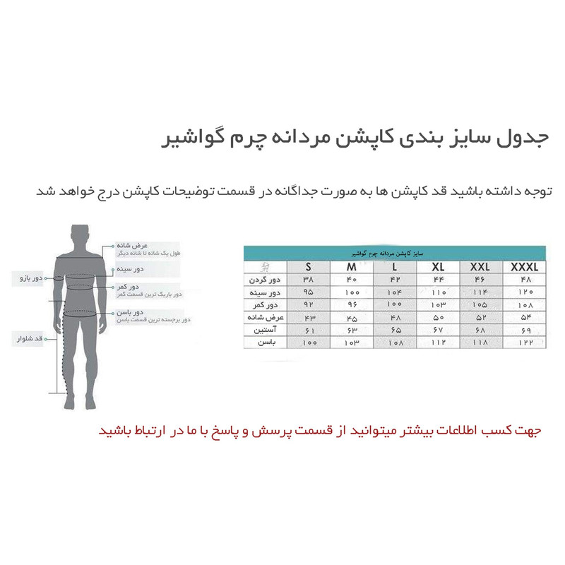طرحسادهتنخور لباسجذبنحوه بسته شدنزیپجزئیاتاستر رویالنگهداری کالاهر سال 2 بار واکس زده شود میتوان به جای واکس از روغن زیتون استفاده کردجنسچرم طبیعی