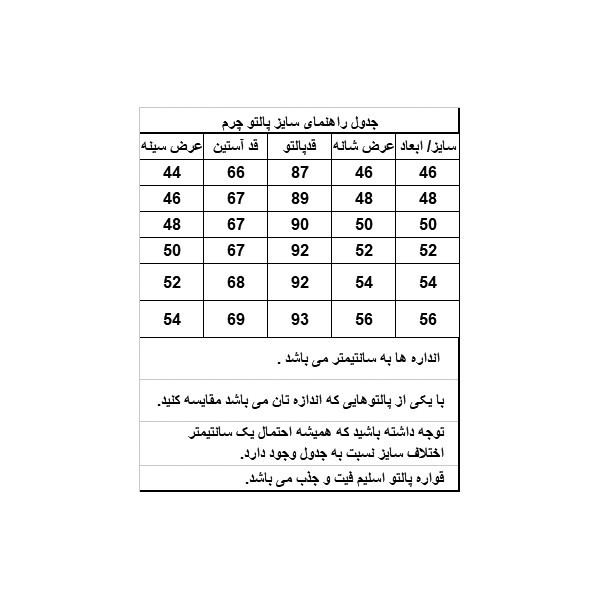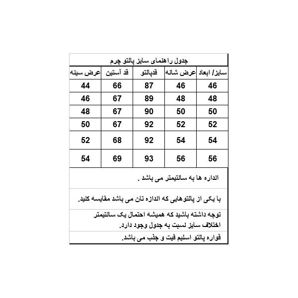 به جدول سایزبندی توجه کنید و سفارش سایز خود را مطابق با جدول سایزبندی انجام دهید هنگام سفارش به تصویر بافت پارچه توجه کنید مورد استفاده این پالتو روزمره و یا رسمی بوده و بنابراین محدودیتی در نوع مصرف نداشته