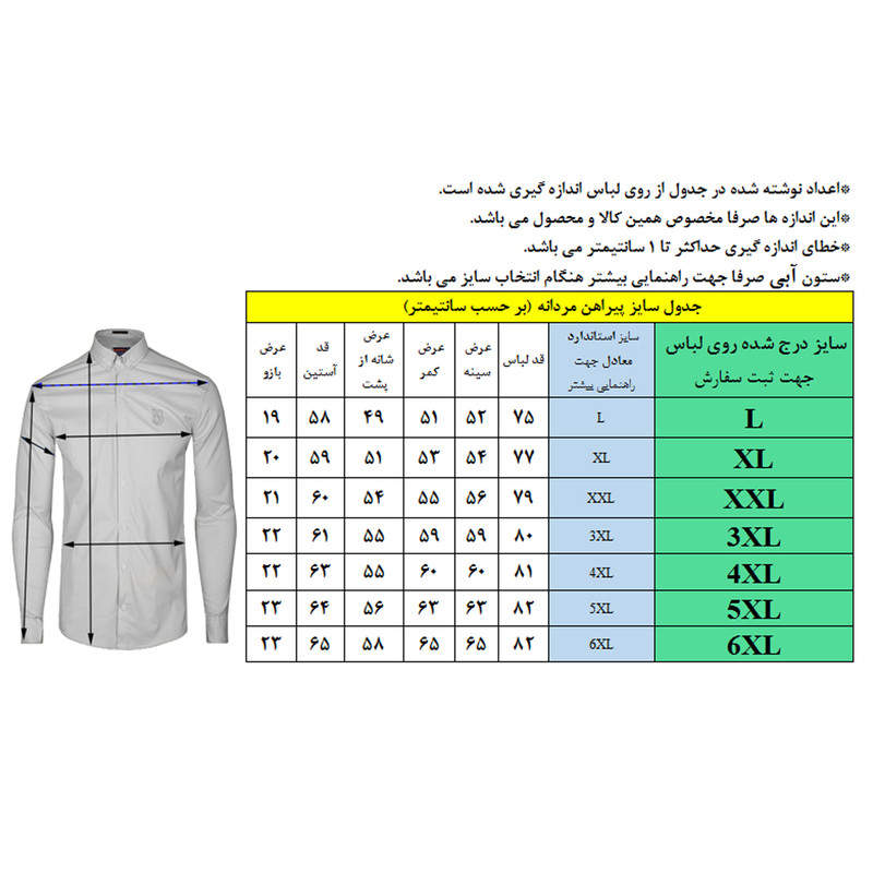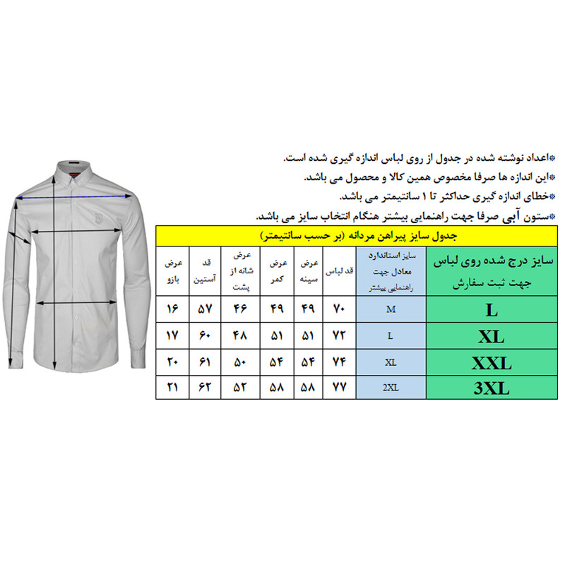 - پیراهن مردانه با قواره اسپورت - نحوه بسته شدن با دکمه - دارای یقه برگردان و آستین بلند - دارای دوخت بازاری و بدون جعبه - راهنمای سایز را برای انتخاب دقیق تر کالا حتما بررسی فرمایید.