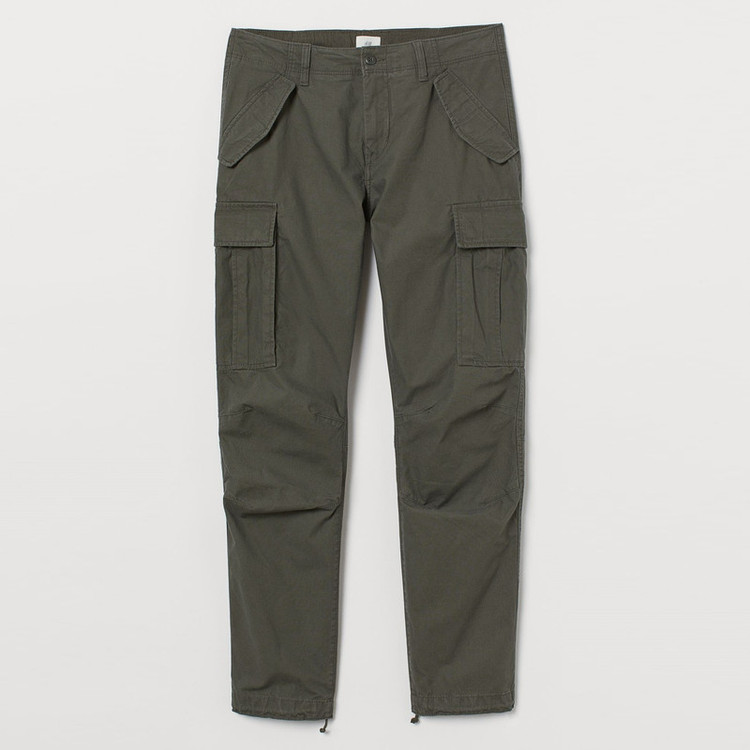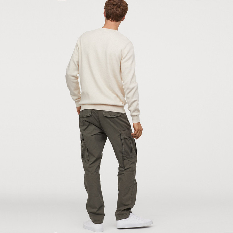 شلوار پارچهای نخی با زیپ و دکمه و جیبهای کنار، پشت و دکمه های پرس مخفی. پاهای مخروطی با درز در زانو.