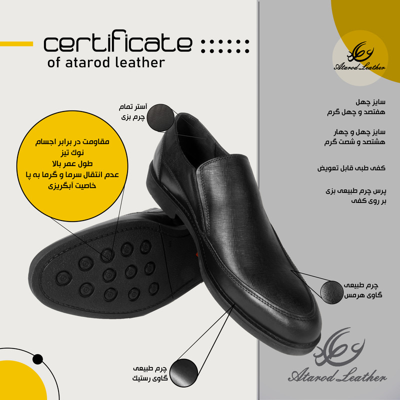رویه کفش تماما ترکیب چرم طبیعی لوکس گاوی روستیک و هرمس برند ثبت شده عطارد آستر داخل کفش چرم طبیعی بزی لوکس کفی تمام چرم طبیعی بزی لوکس زیره لوکس لاستیک بسته بندی اختصاصی چرم عطارد مناسب برای هدیه