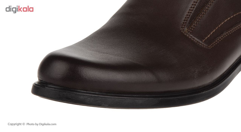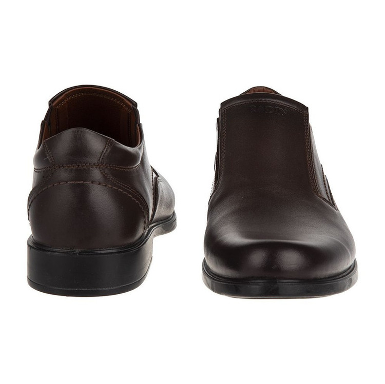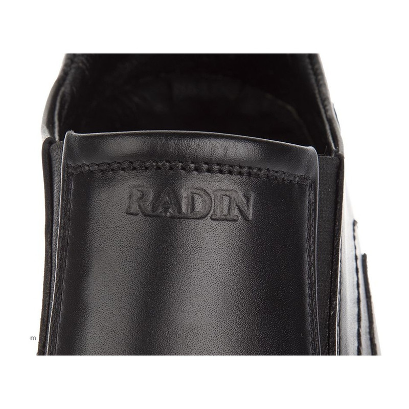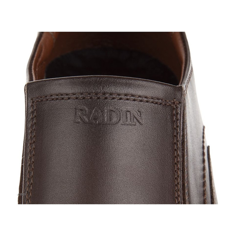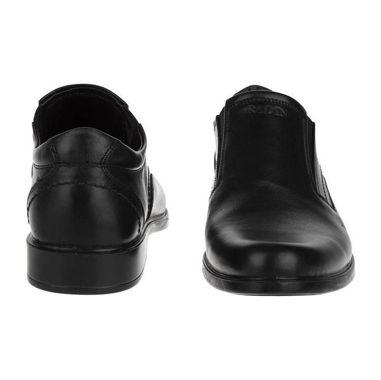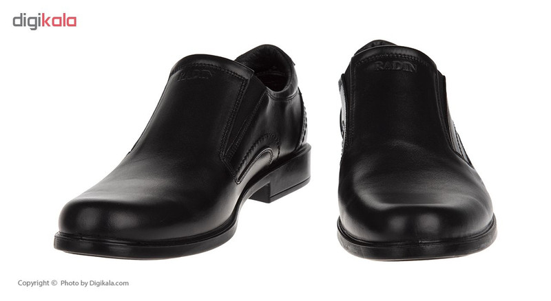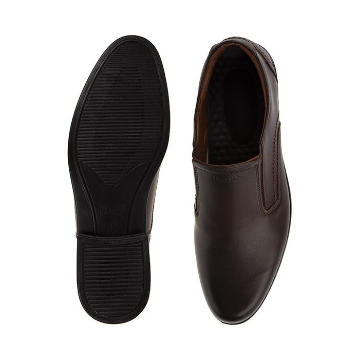 محصول ارائه شده از برند «رادین» از چرم طبیعی تهیه شده است که دارای خاصیت تنفسپذیری است و سبب میشود تا پاها در استفادههای طولانی مدت از آن عرق نکند. رویه این کفش به صورت ساده و تکرنگ تهیه شده است. این کفش به صورت یکسره و بدون بند طراحی شده است. البته در دو طرف آن از کش استفاده شده که باعث سهولت در پوشیدن آن میشود. نوع دوخت، از داخل به رویه کفش است که سبب بادوام شدن هرچه بیشتر این کفش شده است. قالب این کفش دارای پنجه پهن است و با داشتن فضای کافی به انگشتهای پا فشار نمیآورد. زیره کفش به روش تزریق قالبی تولید شده است و به لطف استفاده از پلیاورتان در آن، بسیار نرم و انعطاف پذیراست. همچنین استفاده از پلی اورتان در قسمت زیره کفش، در کاهش وزن کلی آن هم موثر بوده است. کفی این کفش نیز به دلیل داشتن خاصیت آنتی باکتریال، درهنگام استفاده بوی نامطبوع به خود نمیگیرد.