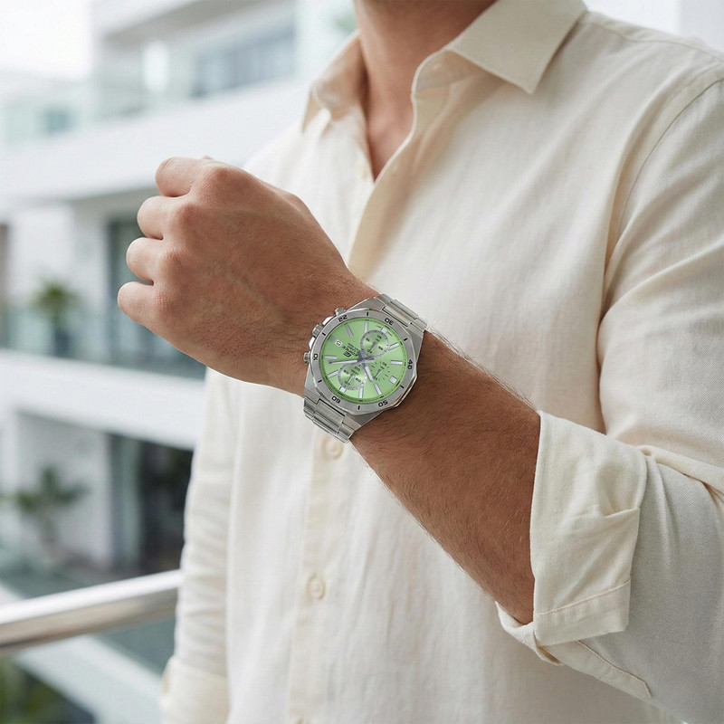 سایر توضیحات : بند قابل تنظیم بین 150 تا 205 میلیمتر کرونومتر با دقت 1/10 ثانیه دقت ساعت: ±20 ثانیه در ماه زمانسنجی آنالوگ: 3 عقربه (ساعت، دقیقه، ثانیه) صفحات فرعی: کرنوگراف 1/10 ثانیهای دقیقهسنج کرنوگراف ثانیهسنج کرنوگراف