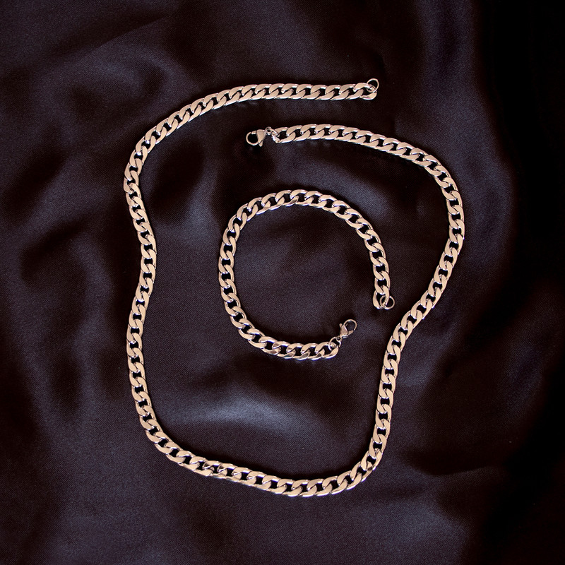 این نیم ست شامل یک گردنبند و دستبند از جنس استیل و به رنگ طلایی است.