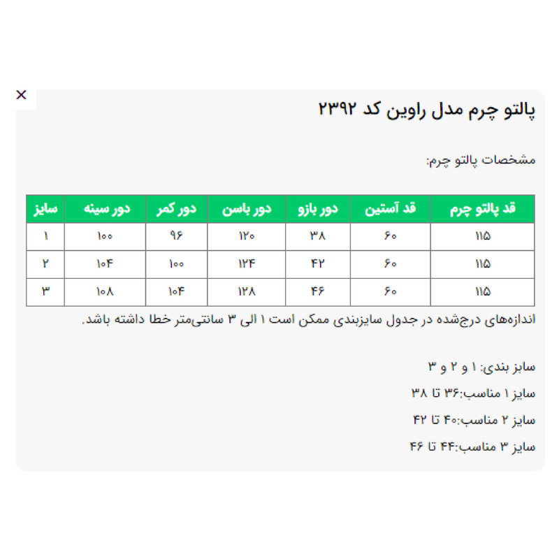قدزیر زانونوع کت چرم زنانهکت چرم بلندجنسچرم مصنوعیطرحسادهتنخور لباسمعمولی (regular fit)مورد استفادهاسپرت , روزمرهجنس آسترپلی استر