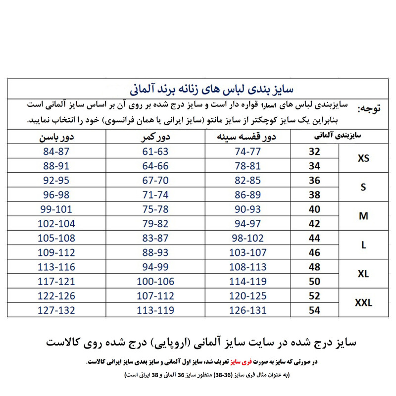 سایزبندی این کالا بر اساس سایز آلمانی است . بنابراین یک سایز کوچک تر از سایز ایرانی خود را انتخاب کنید.
