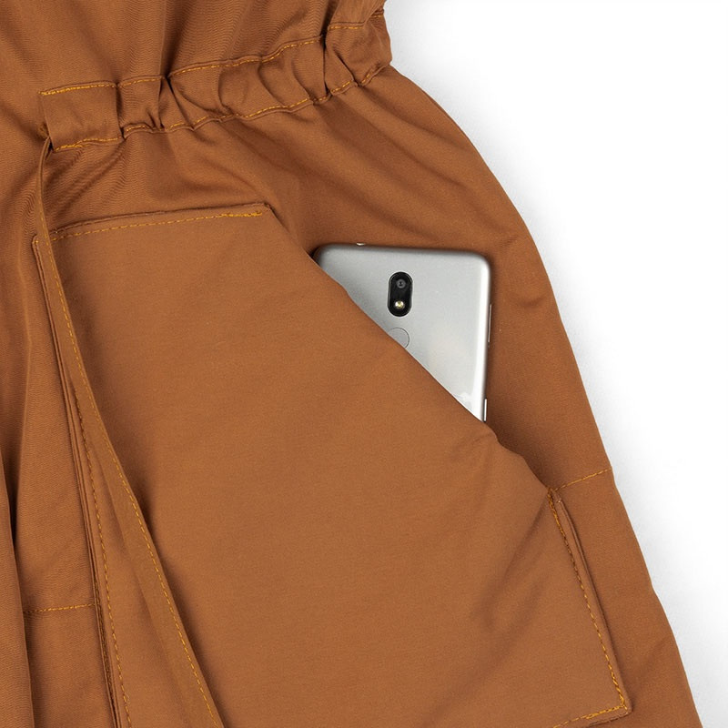 با دکمه و زیپ بسته میشود و کمربند دارد.