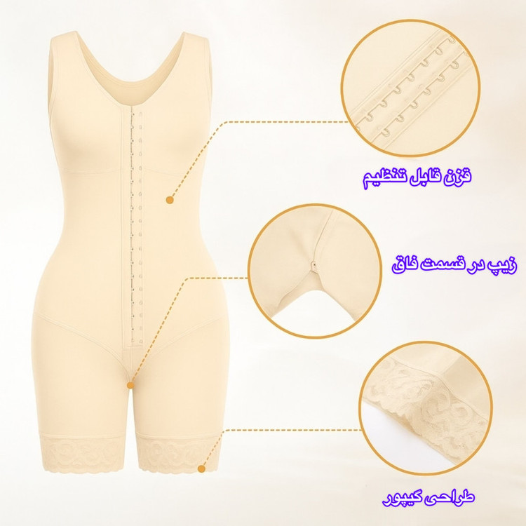 رنگ گن کرمی میباشد ، هم قزن دارد هم زیپ در قسمت فاق ، فشار در قسمت شکم و پهلو بیشتر میباشد ، قسمت ران و باسن فشار متوسط است