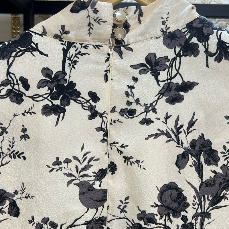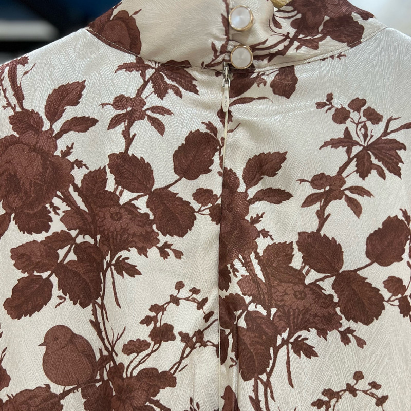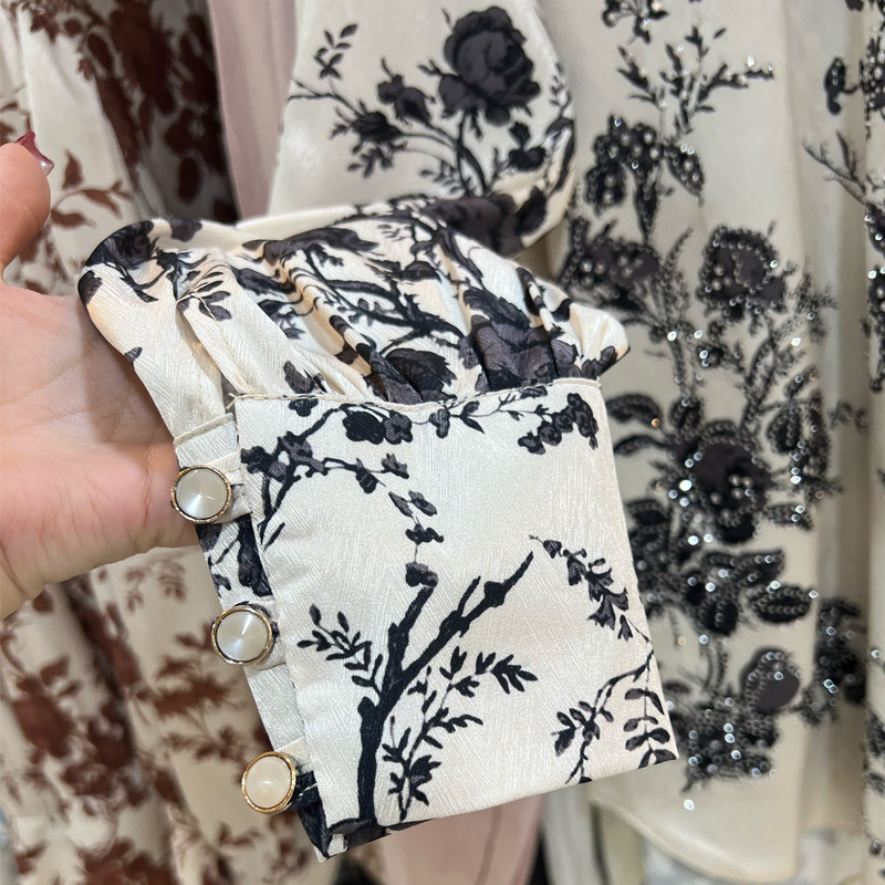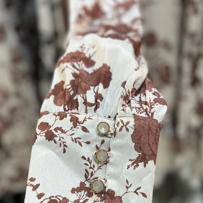 آستین بلند با دوخت دقیق و ایستایی نرم: برشهای حسابشده در آستینها، در کنار پارچهی ابریشمی، جلوهای فوقالعاده ظریف دارند.