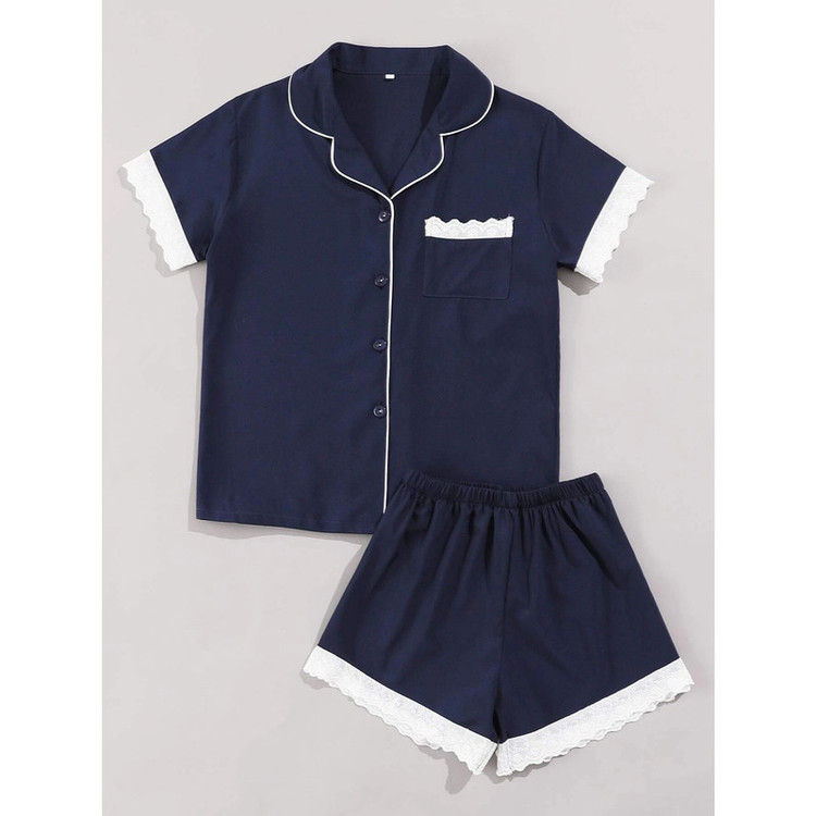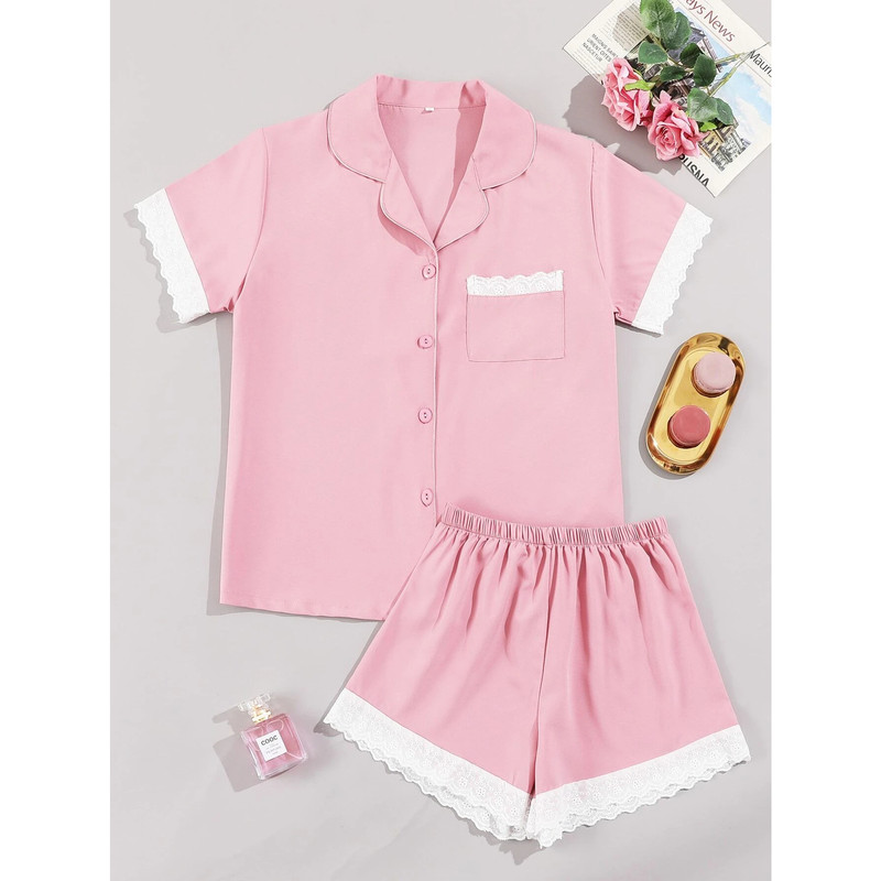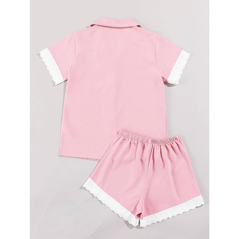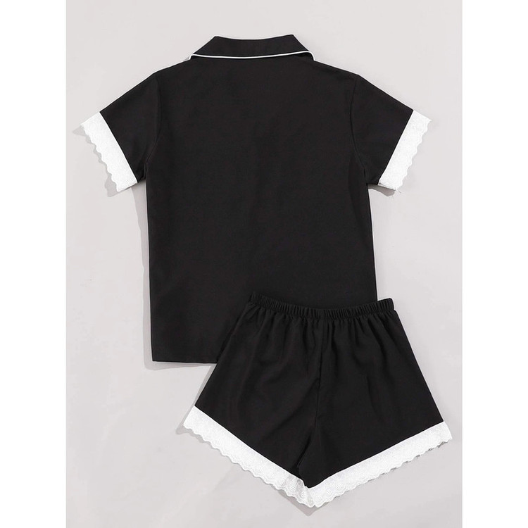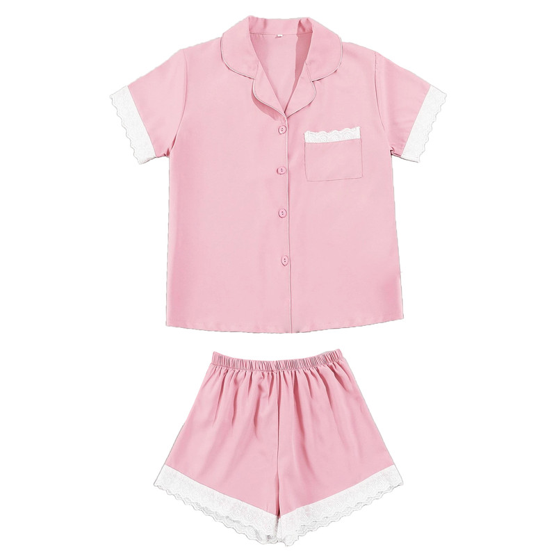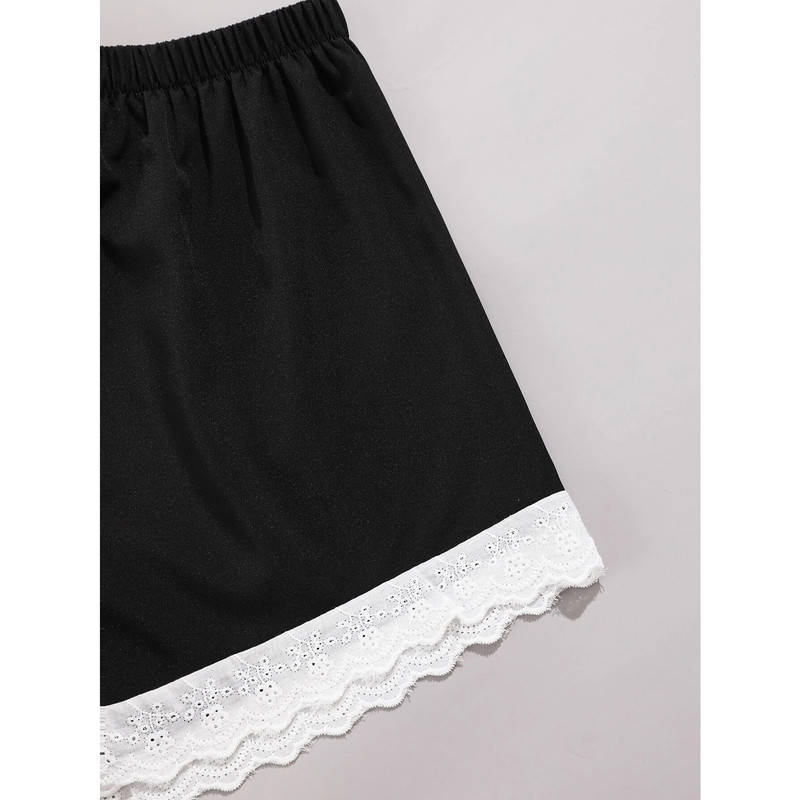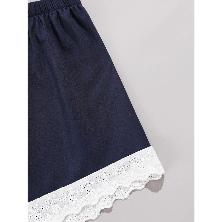 -ست لباس خواب زنانه شامل شومیز قیطون دوزی ساتن و شلوارک ساتن
