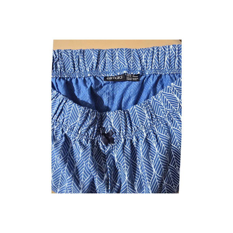 جنس نخی نرم و لطیف محصول شرکت لیدل ( LIDL ) خنک و راحت با ضخامت کم پاپیون تزیینی بر روی کمر رنگ زمینه آبی جنس نخی با طرح چاپی برجسته مدل کمر کشی بدون بند قابلیت کشسانی دارد دارای نشان استاندارد oeko-tex متریال ۱۰۰٪ نخ
