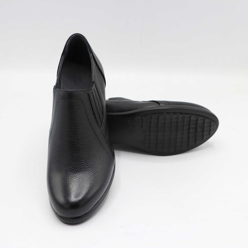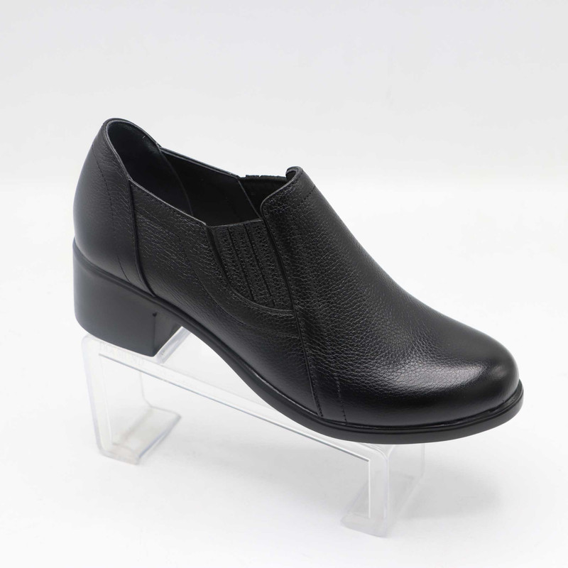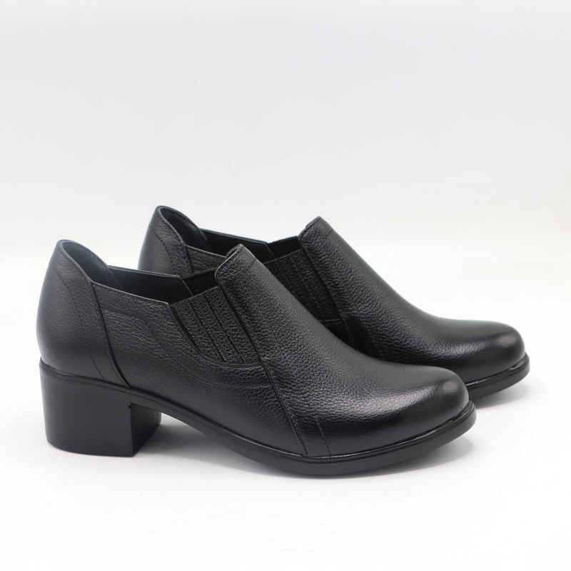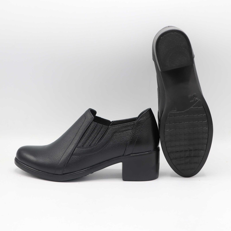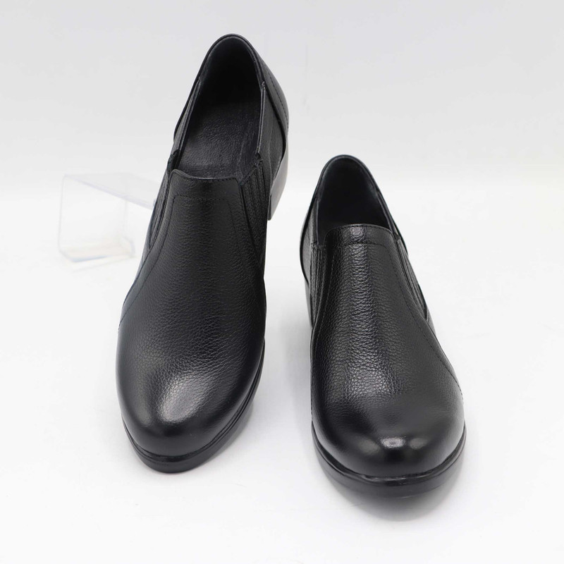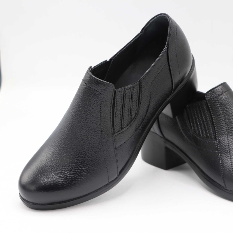 این کفش زنانه از جنس چرم طبیعی با بافت ریز ساخته شده است. طراحی کفش شامل قسمت جلوی کشیده و نسبتا باریک با رویهای ساده و دوختهای ظریف است. دو کش در طرفین کفش تعبیه شده که به راحتتر پوشیدن آن کمک میکند و باعث میشود کفش به خوبی روی پا فیکس شود.