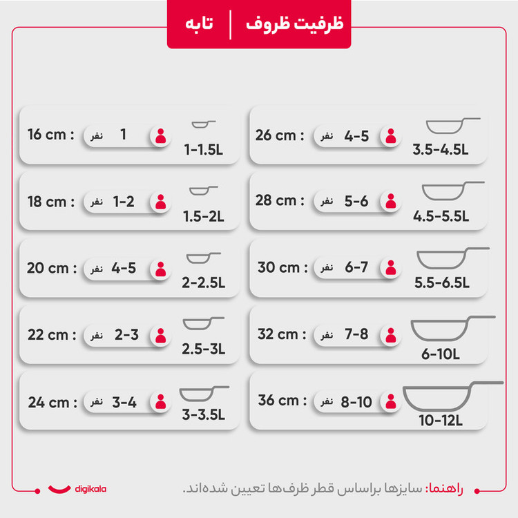 وزن ظروف: قابلمه سایز ۲۸: ۱۹۸۰ گرم، قابلمه سایز ۲۴: ۱۵۸۵ گرم، قابلمه سایز ۲۰: ۹۴۵ گرم، تابه سایز ۲۸: ۱۹۱۰ گرم