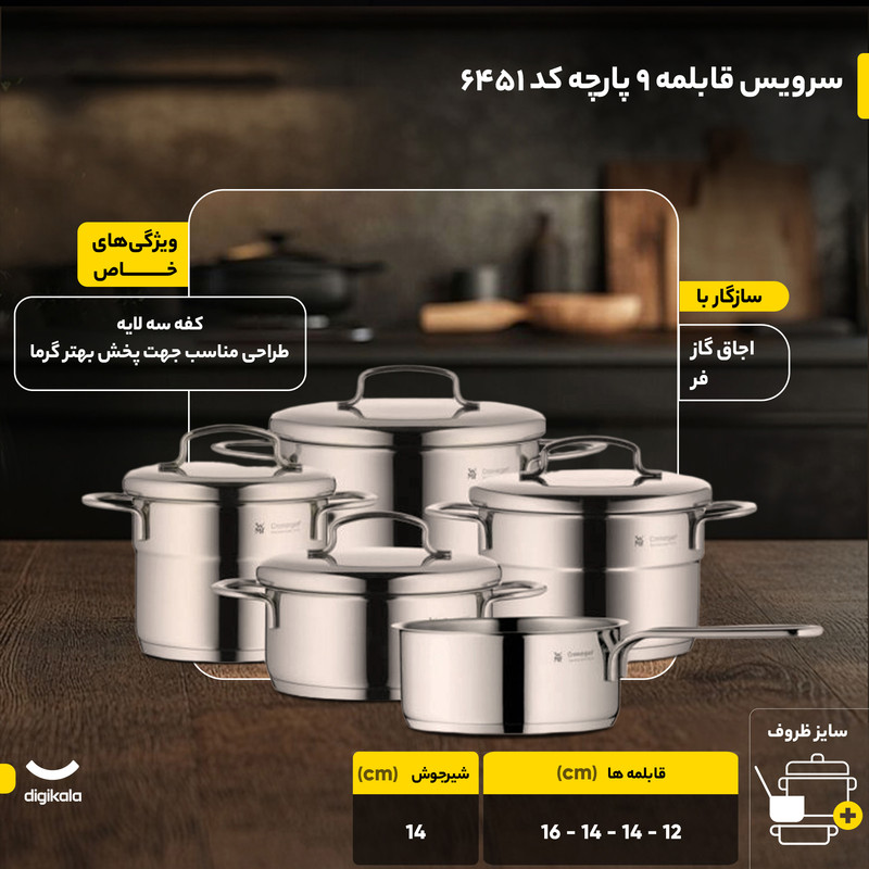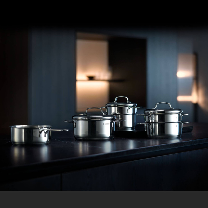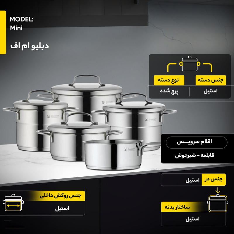 دستههای استیل پرچ شده این ظروف، علاوه بر استحکام بالا، امکان استفاده از آنها را درون فر نیز فراهم میکنند که کارایی این مجموعه را دوچندان کرده است. این سرویس ۹ پارچه شامل چند قابلمه کوچک و یک شیرجوش کاربردی است که برای تهیه سس، پختهای کمحجم یا گرم کردن غذا ایدهآل هستند. این مجموعه با انواع اجاق گاز نیز سازگاری کامل دارد. در نهایت، سرویس قابلمه WMF Mini برای کسانی که به دنبال کیفیت افسانهای WMF در ابعادی کوچک و کاربردی هستند، یک انتخاب بینقص و هوشمندانه است.
