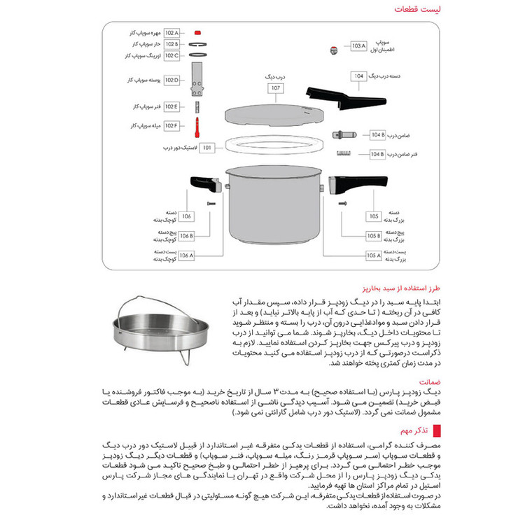 ویژگی زودپز: سبد بخارپز , در پیرکس , کف سه لایه , دستگیره بلند
