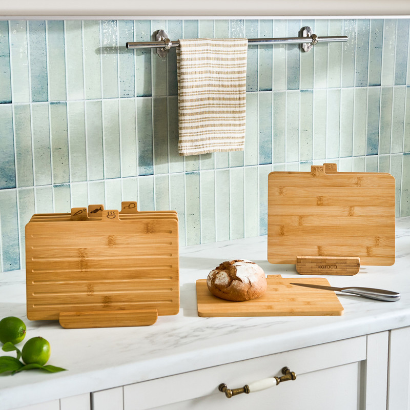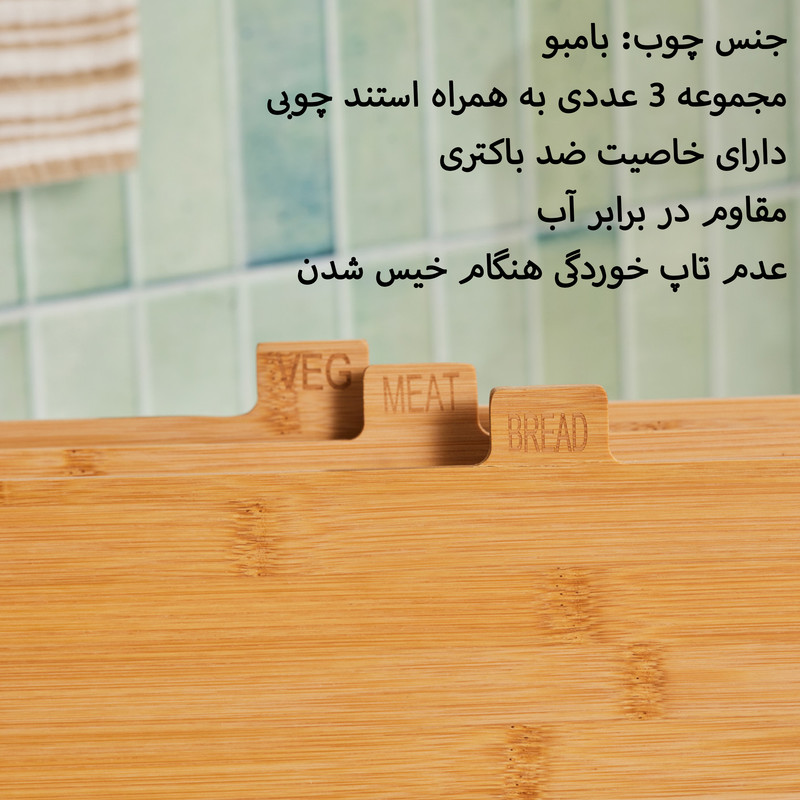 تخته برش 4 تکه کاراجا مدل Arel - جنس چوب: بامبو - محصول کشور: ترکیه - مجموعه 3 عددی به همراه استند چوبی - ابعاد: 28x22x0.9سانتی متر - ابعاد استند: 14x10x3.8 سانتی متر - دارای خاصیت ضد باکتری - مقاوم در برابر آب - عدم تاپ خوردگی هنگام خیس شدن
