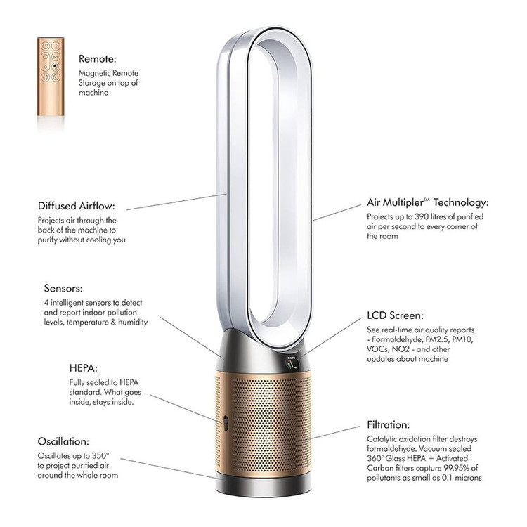 زاویه چرخش: تا ۳۵۰ درجه برای پوشش کامل فضا / تنظیمات سرعت: ۱۰ سطح مختلف / وزن: حدود ۴.۸۵ کیلوگرم / طول کابل برق: ۱.۸ متر / قابلیت کنترل: از طریق ریموت کنترل، اپلیکیشن MyDyson و دستیارهای صوتی مانند Alexa و Google Assistant /
