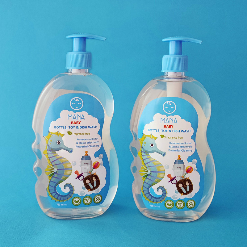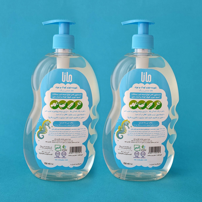 بسته دو عددی مایع شوینده و ضدعفونی کننده لوازم کودک و نوزاد مانا با درب پمپی هر یک با حجم 750ml و فاقد اسانس و رنگ بوده و مناسب شستشوی کامل انواع شیشه شیر، پستانک، آبمیوه خوری، ظروف کودک و اسباب بازی آنها می باشد.