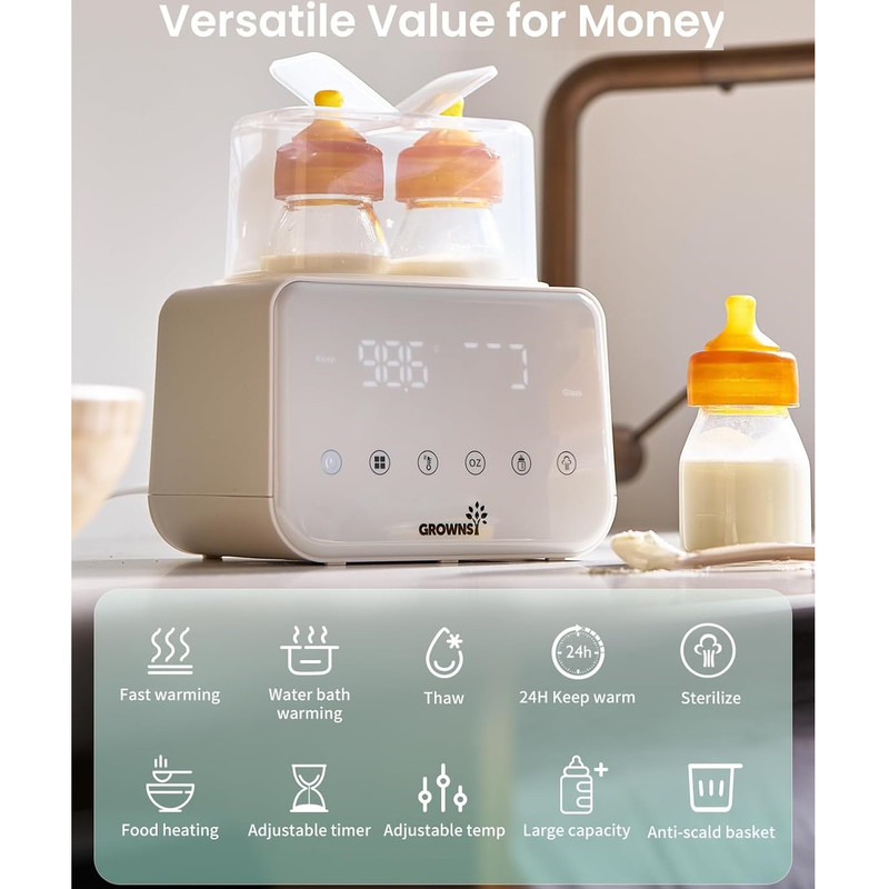 عملکرد هوشمند ۱۰ در ۱: این گرمکن چندکاره ده عملکرد را در یک دستگاه ارائه میدهد: بخاردهی سریع، گرم کردن با آب، یخزدایی، گرم نگهداشتن ۲۴ ساعته، استریل کردن، گرم نگهداشتن غذا، تایمر قابل تنظیم، دمای قابل تنظیم، ظرفیت زیاد و سبد ضد سوختگی. طراحی شیشه شیر دوتایی آن برای خانوادههای دارای دوقلو عالی است و ضمن صرفهجویی در فضا و هزینه، تمام نیازهای تغذیهای را برآورده میکند.