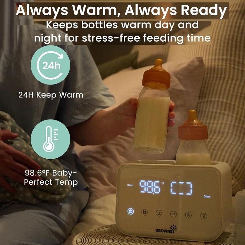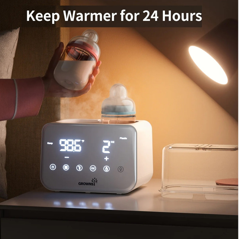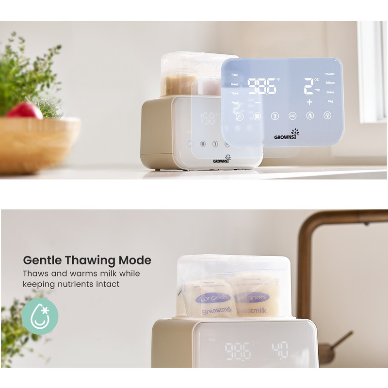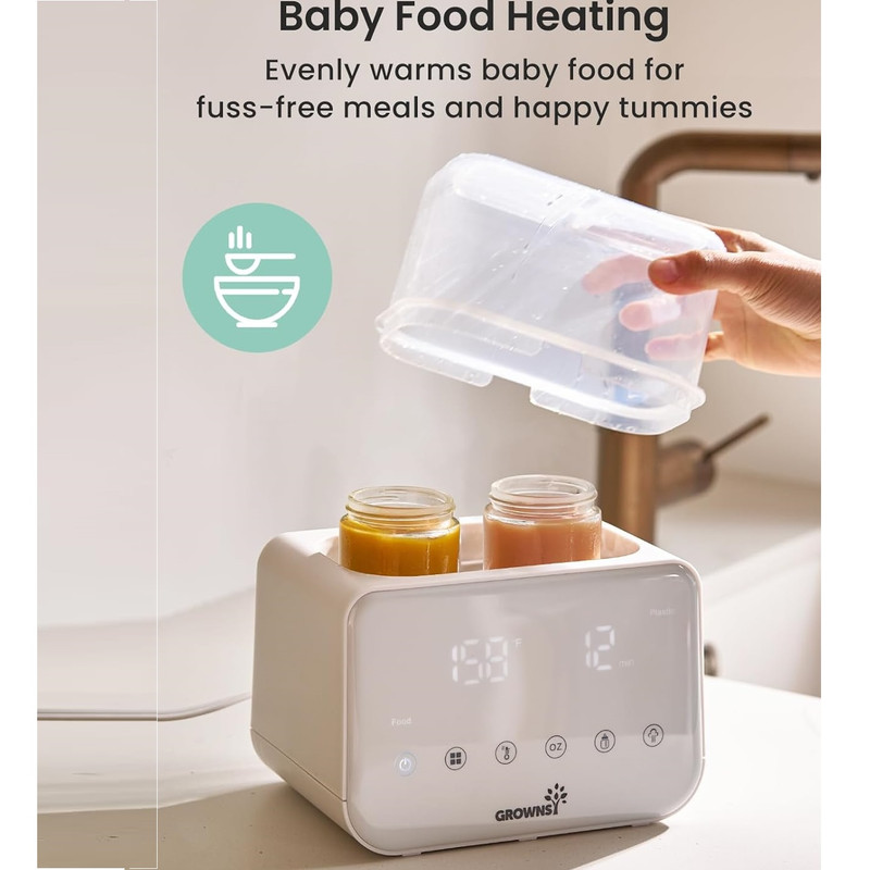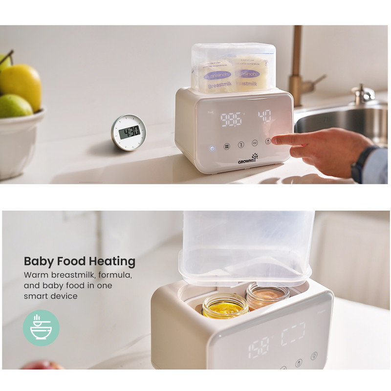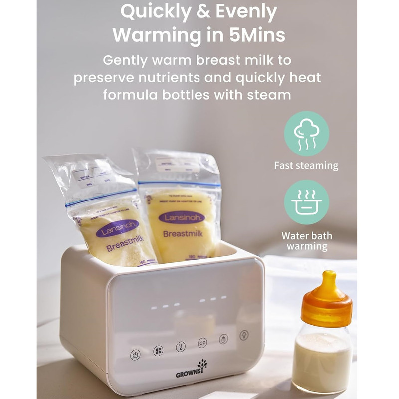 گرم کردن سریع با بخار و حمام آب: گرمکن شیشه شیر Grownsy شیر را به سرعت و تنها در عرض ۲ تا ۴ دقیقه با بخار گرم میکند که برای آرام کردن نوزاد گرسنه در طول شیردهیهای آخر شب ایدهآل است. فرآیند گرم کردن ملایم با حمام آب، دمای مناسب شیردهی را حفظ میکند و از هدر رفتن مواد مغذی ناشی از گرم شدن بیش از حد یا قرار دادن در مایکروویو جلوگیری میکند.