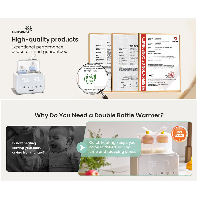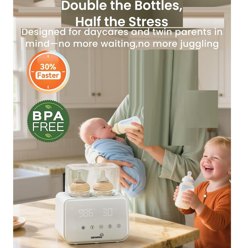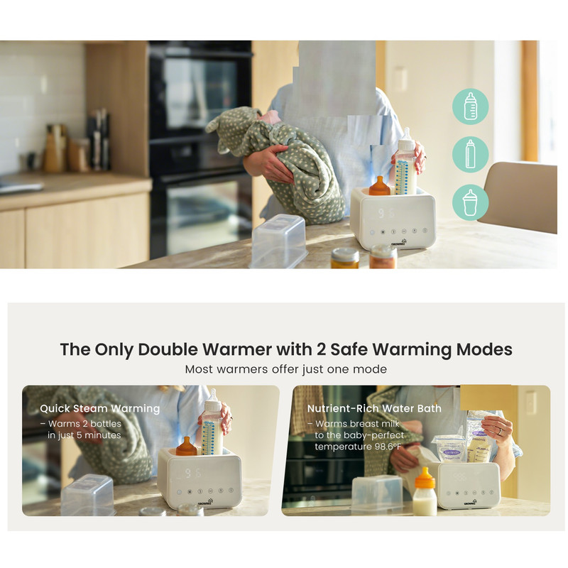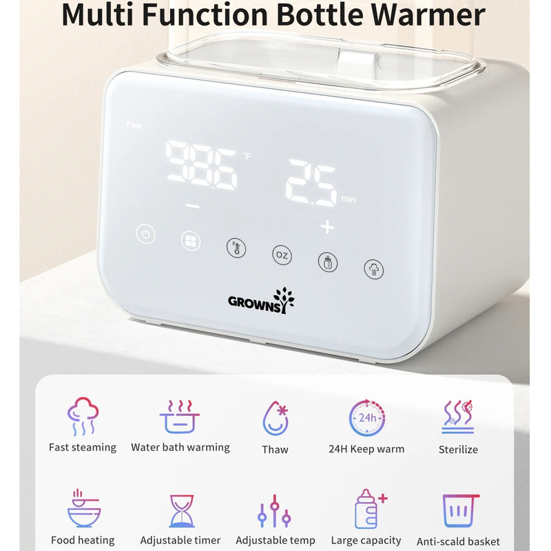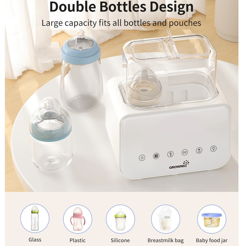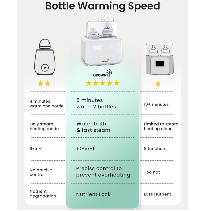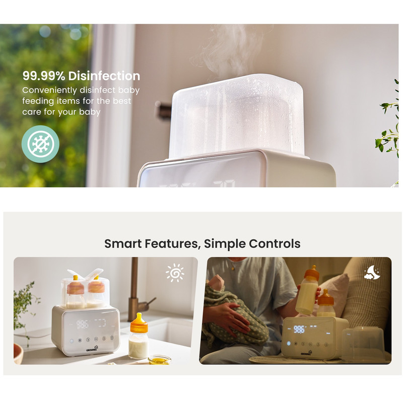 گرم کردن سریع با بخار و حمام آب: گرمکن شیشه شیر Grownsy شیر را به سرعت و تنها در عرض ۲ تا ۴ دقیقه با بخار گرم میکند که برای آرام کردن نوزاد گرسنه در طول شیردهیهای آخر شب ایدهآل است. فرآیند گرم کردن ملایم با حمام آب، دمای مناسب شیردهی را حفظ میکند و از هدر رفتن مواد مغذی ناشی از گرم شدن بیش از حد یا قرار دادن در مایکروویو جلوگیری میکند.