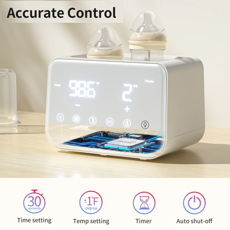 کنترل دقیق دما: گرمکن Grownsy که مجهز به سیستم کنترل دمای پیشرفته است، گرمایش دقیق را برای عملکردهای مختلف تضمین میکند. تنظیمات را میتوان دقیقاً تا 30 ثانیه برای زمان و 1 درجه سانتیگراد برای دما انجام داد و شرایط ایدهآل تغذیه را تضمین کرد.