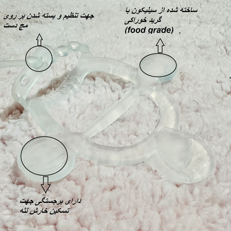 ساخته شده از جنس نرم و انعطاف پذیر-قابلیت فیکس شدن بر روی مچ دست-دارای برجستگی جهت تسکین التهاب و خارش لثه-طراحی ارگونومیک شباهت به سینه مادر برای تازه متولدین/ فاقد PVC/ سایز: Free